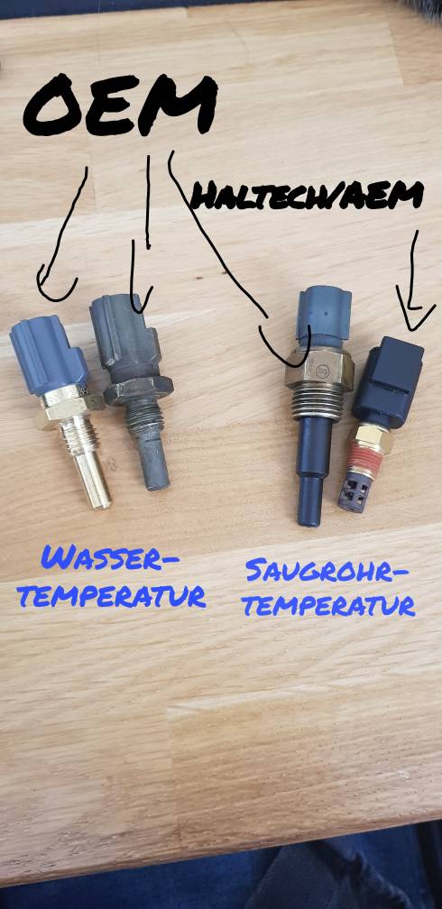 Bei dem OEM-Ansaugtemperatursensor (89424-24010) bin ich mir etwas unsicher. Der sieht mir sehr klobig aus und in den Logs scheint er auch sehr träge zu sein. Wenn man mal einen Haltech/AEM Aftermarket Sensor dagegen legt, sind diese deutlich kleiner und auch vom Aufbau anders.