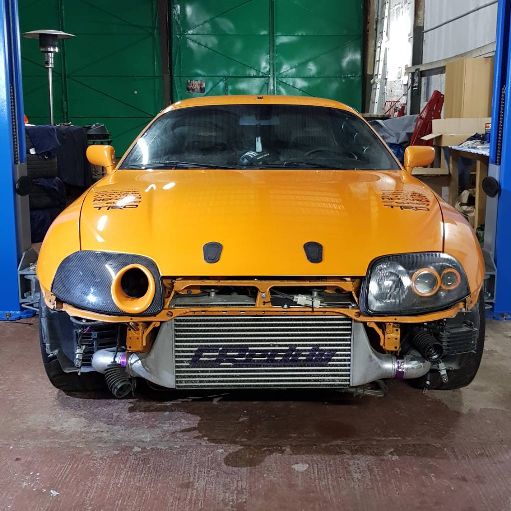 Ich habe dann anschließend bei RHD Speedmasters, Turbologic und HK-Power angefragt. Die Preise waren sehr variabel, allerdings auch mit jeweils anderen Paketen. In dieser Zeit spielten mehrere Faktoren eine Rolle. Es sollte möglichst bald losgehen und nicht all u aufwenidg sein.  Z.B. hatte ich mit Sven (Exotic Supra) schon ein bisschen geschrieben gehabt, da ich ihn und seine Kommentare bei www.toyota-supra.de bisschen verfolgt (da war ich hier noch nicht)  habe und mitbekommen habe, dass er bei HK-Power arbeitet und er und der Holger sehr kompetent erschienen (und auch sind denke ich) . Allerdings komme ich aus Brandenburg und HK-Power ist am anderen Ende von Deutschland. Meine Versicherung war auch schon abgelaufen und mit Autohänger die ganze Strecke abfahren, wäre echt eine Ansage gewesen. Bei HK-Power war es glaube ich aber so, dass wir schon die Haltech verbauen hätten müssen. Ich halte sehr viel von diesem Steuergerät, allerdings war ich schon ganz schön Pleite durch den Kauf des Autos und es standen noch weitere notwendige Anschaffiungen für den TÜV an, die unausweichlich waren. Zum einen hatte die Abgasanlage keinen KAT, der musste also her. Zum anderen waren da Felgen drauf, die ich einfach nicht zuordnen konnte und auch keine Papieren hatte. Also allein für Felgen/Reifen und KAT waren nochmal paar tausend Euro einzuplanen. Bei RHD machen die glaube ich hauptsächliche Eintragungen und keine Umbauten (z.B. KAT)…bin mir aber nicht sicher. RHD meinte nur per Mail, dies und das musst ich auf jedenfall ändern bevor ich da zum TÜV komme. Nun bin ich von Hause aus kein Mechaniker und kann z.B. auch nicht gut schweißen. Da es meist um viel Geld geht und ich ja neu in der Szene war, wollte ich auch nicht in Eigenregie irgendwas verbauen und dann ist es am Ende doch nicht eintragungsfähig. Ich glaube gerade beim KAT kann man viel falsch machen. Also Ende vom Lied war, dass Turbologic (Berlin) am dichtesten dran war und sich auch am ehesten gemeldet hatte, sodass ich dann schlussendlich dort hingefahren bin. Mir ging es in erster Linie darum, dass ich alle für den TÜV notwendigen Umbauten machen lasse und letztendlich eine Supra mit deutschem Vollgutachten bekomme.