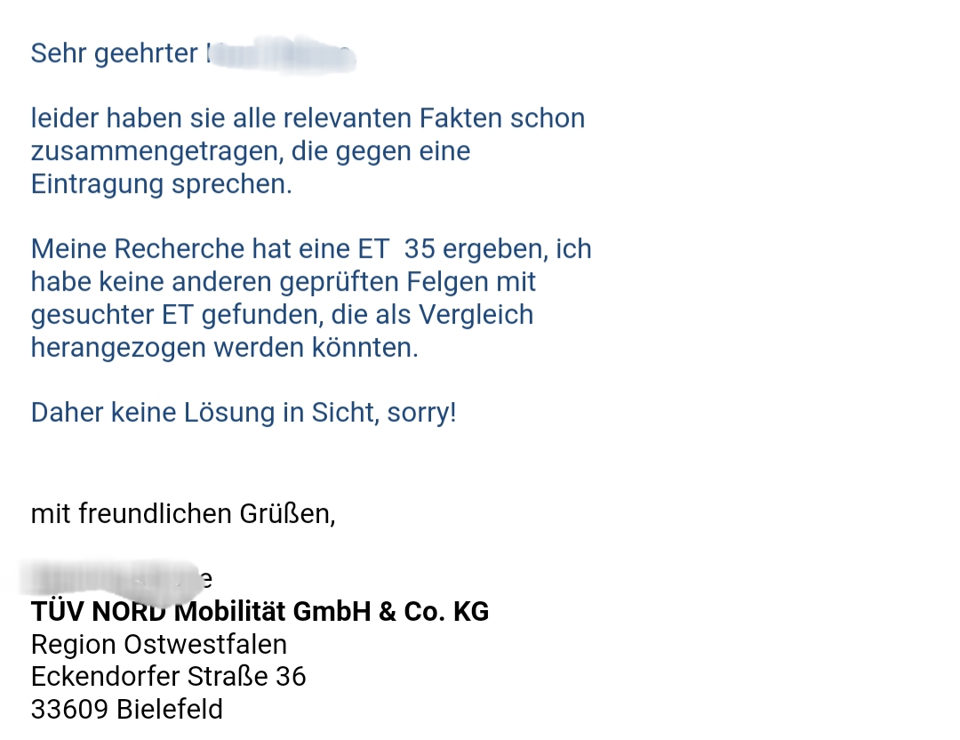 habe meine neuen Felgen bekommen, diese haben an der VA ET44. Geplant war sie mit 10mm Spurplatten zu fahren (dann ET34) damit diese über die Bremse drüber gehen. Leider sind die 10mm ein bisschen zu wenig. Brauche nun doch wohl 15mm Spurplatten. Leider geht das H&R Gutachten nur bis ET34 runter. Kennt einer noch andere Hersteller für Spurplatten oder hat sonstige Dokumente die besagen das man auf der VA ET29 oder weniger noch sicher fahren kann?