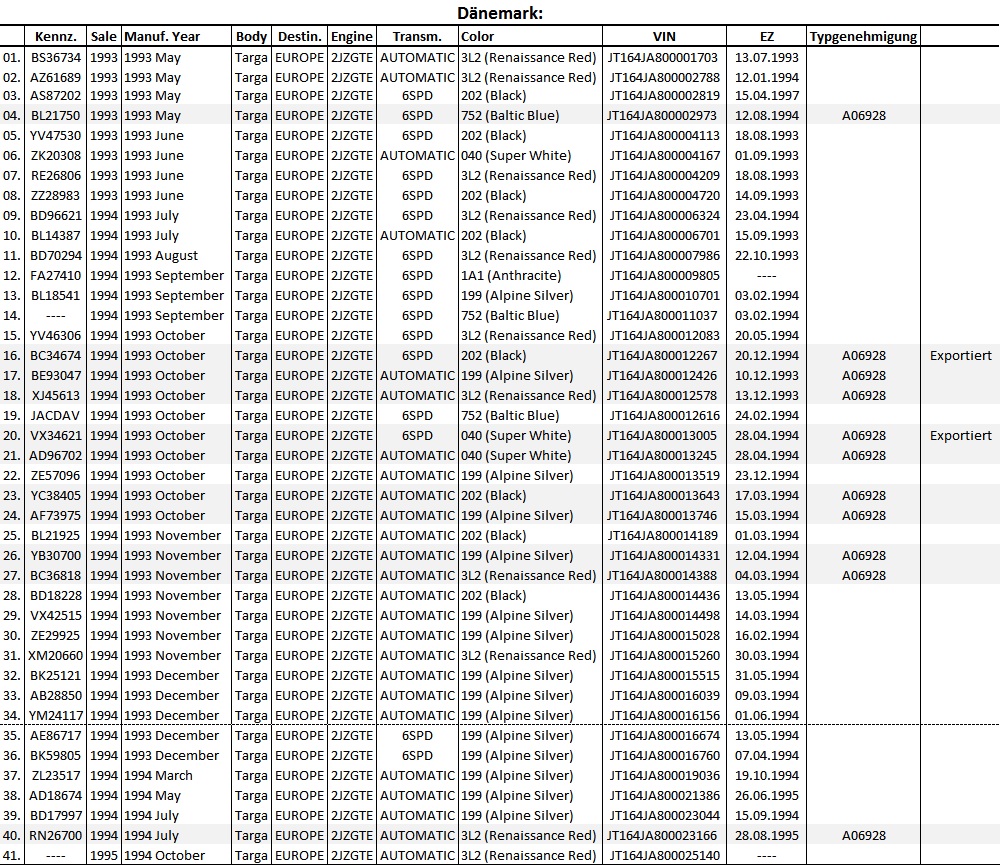 Weiterhin werde ich über den Vorbesitzer versuchen die VIN's von Toyota Dänemark prüfen zu lassen, ob die Erstzulassung dort erfolgte. Ein Indiz ist die Typgenehmigungsnummer die bei 11 Fahrzeugen mit aufgeführt ist. Aktuell gehe ich davon aus das es sich dabei um 11 Dänische Erstzulassungen handelt (ggf. noch mehr vor der Digitalisierung) und die anderen 30 Fahrzeuge Importe sind.