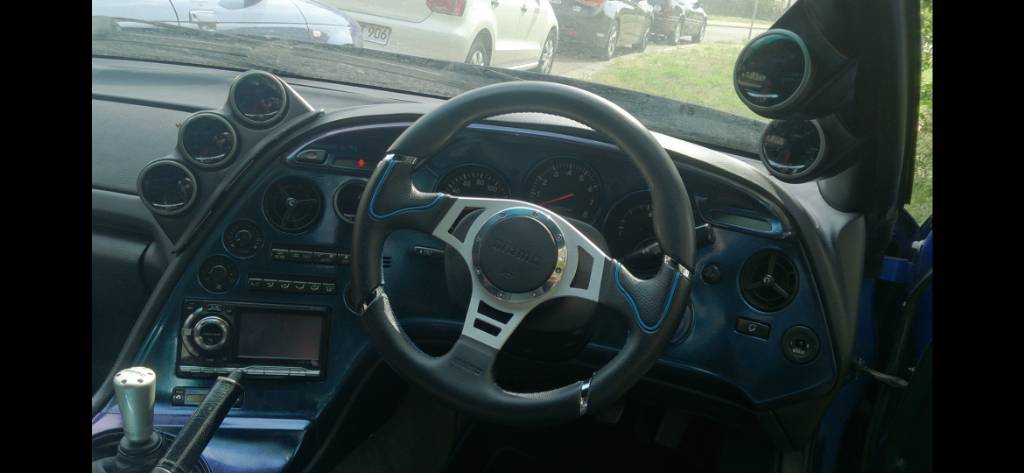 Umgebaut wurde der schmale wasserkühler der Sauger auf den dickeren der turbo. Eine stärkere ungefederte Kupplung, Zusatzanzeigen, eine neue Batterie, offener luftfilter von k&n, der tacho wurde von Stefan und Freitag auf led umgebaut, eine großen ölkühler, led rückleuchten und das dash hat eine andere Farbe bekommen.