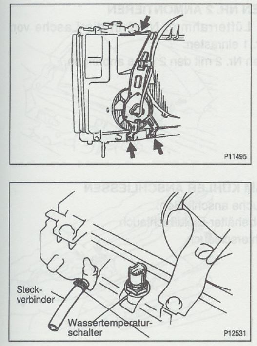 Zusätzlich gibt es noch einen Wassertemperaturschalter im Radiator, der denke ich mal ein Relais schalten soll, um die elektr. Lüfter an-/und ab zuschalten. Der ist bei mir gar nicht gesteckt. Ich glaube die werden über die Klima angesteuert und nicht über die Motor-ECU bzw. der Wassertemperaturschalter schaltet dann vermutlich selbstständig das Relais frei.