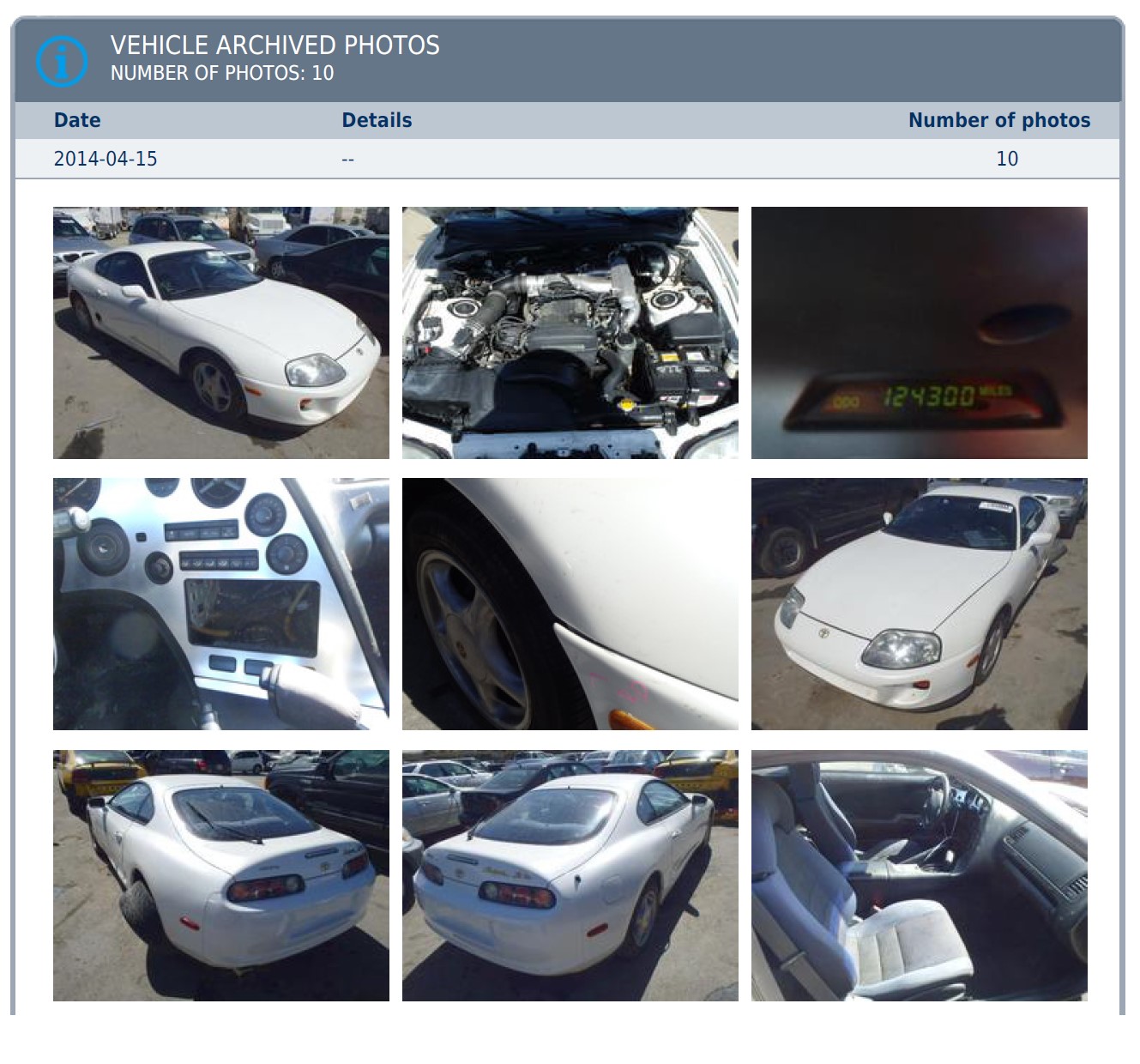 Habe mir die Berichte von Carfax, Vinchecker und autoDNA gekauft. Auto DNA hatte dann noch Bilder der Auktion gespeichert, durch ne Rückwertssuche habe ich dann noch einen alten Auktionseintrag gefunden mit einer mini Schadenbeschreibung.