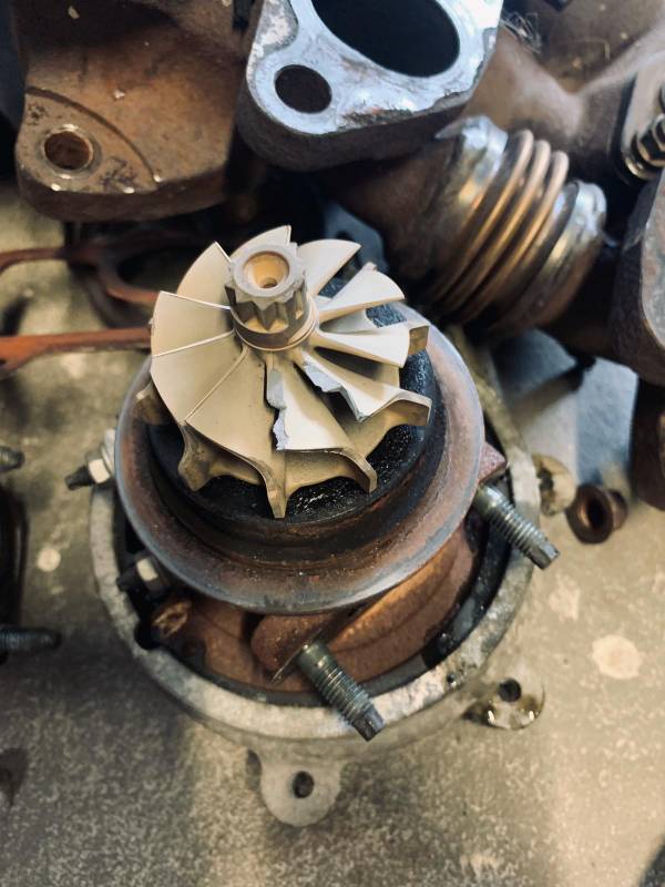 Da Stefan die Möglichkeit hat beim TÜV einen Single Turbo Umbau abnehmen und eintragen zu lassen hab mich im laufe 2020 noch für einen großen Lader entschieden.. Lader, Krümmer, Düsen etc sind bestellt.. Die Twins sind mittlerweile draußen und das Bauchgefühl hat mich auch nicht hängen lassen, da die Turbos beide an der Abgasturbine ein weggebrochenes Blade haben und im Krümmer auch Risse gefunden wurden..