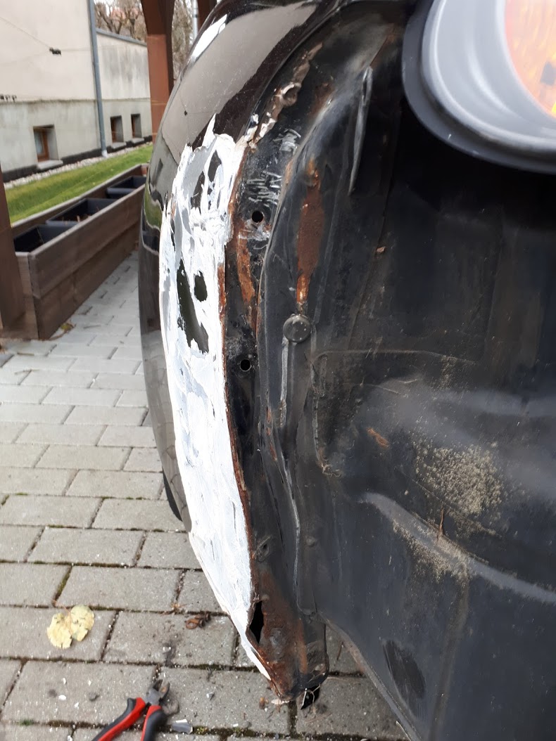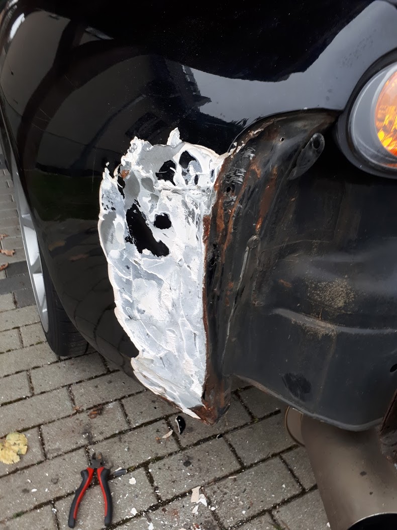 und Quarter Panel wurden dabei durch Spachtel zu einem Teil geeint und die Schürze zusätzlich mit einer Spax-Schraube im dahinterliegenden Blech